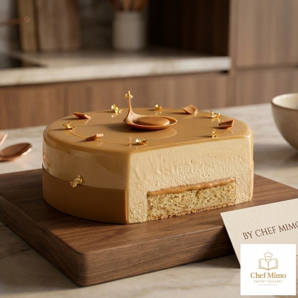 This is a showstopping dessert featuring multiple textures: a crunchy base, a soft banana sponge, a rich liquid praline, and an airy caramel-peanut mousse, all finished with a glossy mirror glaze.